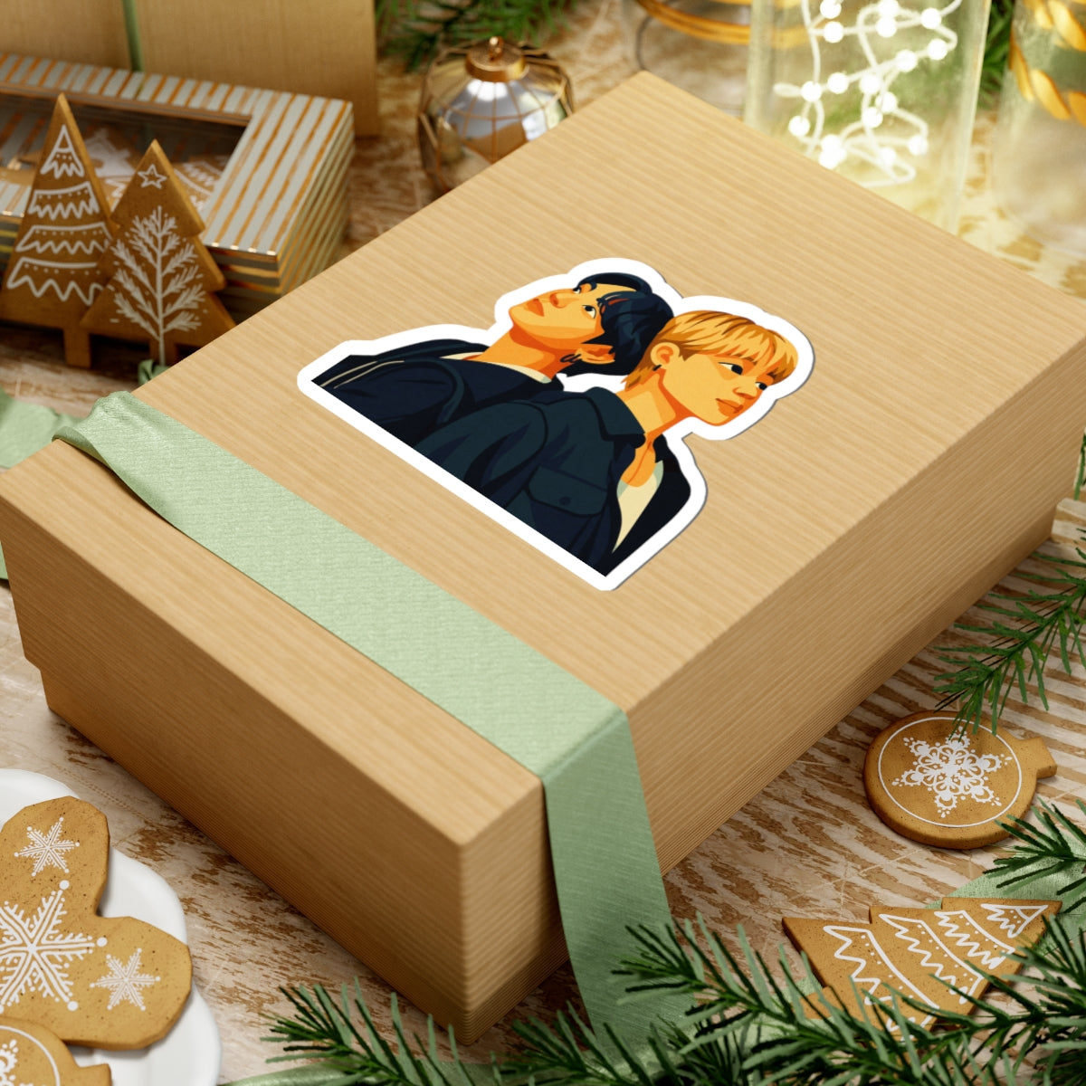 Inspired by the current media promotions for Are You Sure?! Season 2, these glossy stickers capture a warm, illustrated portrait of Jimin and Jungkook standing shoulder-to-shoulder, their faces turned upward as if toward a shared hope. The vibrant eco-solvent inks bring the golden highlights and deep shadows to life on durable vinyl, giving each sticker a lively, poster-like finish that pops on laptops, journals, or phone cases. These stickers add a personal, expressive touch to everyday gear for fans who want a subtle, stylish way to show connection and admiration.